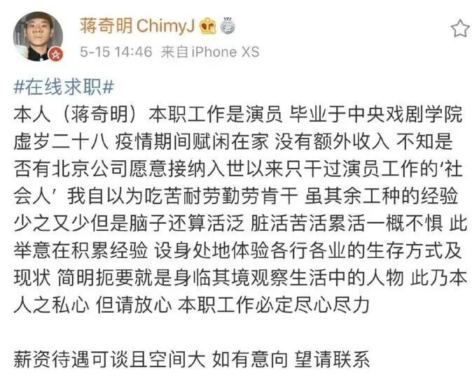 后来(2020年)去发微博求职,是因为那个阶段我的确没有什么工作,我发现在一个非常极端的情境里面,做演员这个职业,除了演戏什么都不会了。我就发了一个简历,想着有没有机会趁这个时间去尝试各种各样的事情。我觉得个人的经历积累,是在成为角色之前很重要的事情。