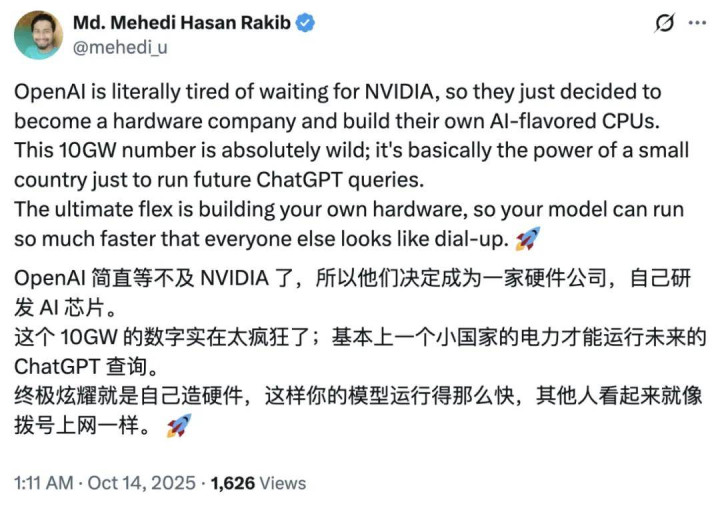 这家 AI 巨头宣布与全球领先的芯片厂商之一博通建立战略合作,共同部署由前者设计的 10 吉瓦规模的 AI 加速器。吉瓦是一个功率单位,1 吉瓦等于 100 万千瓦。举例来说,一个普通家庭的峰值用电功率可能在 10 千瓦左右。这意味着,1 吉瓦的电力大约可以同时为 10 万个家庭供电。