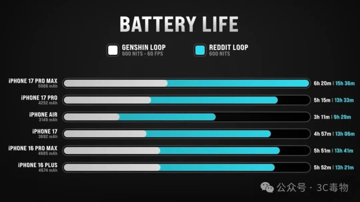 从测试结果来看,iPhoneAir在不同的软件的续航测试表现上,均处于垫底。